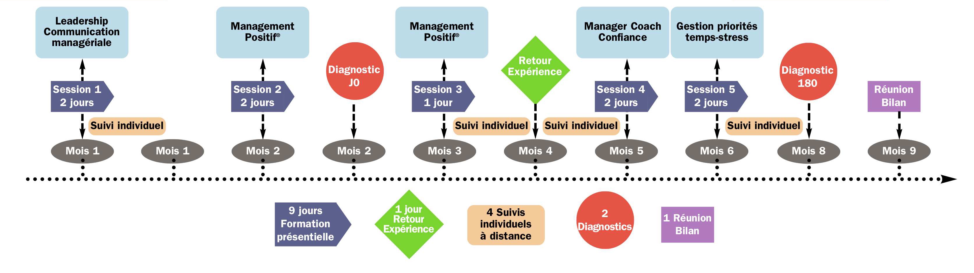 Le parcours de formation au Management Positif® est modulable en fonction des attentes de l'entreprise. Le parcours complet s'inscrit dans la durée(9 mois en moyenne / 76 heures).